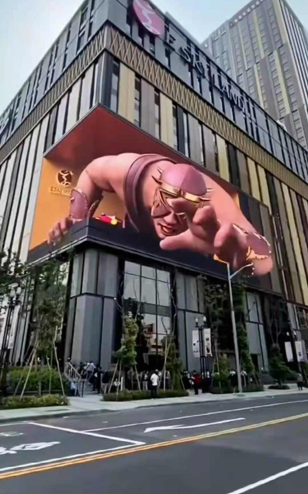 本裸眼3D大屏造型為L(cháng)型,通過(guò)折角打造出裸眼空間感,通過(guò)仰視再加上獨眼二郎出屏的3D特效,整體體現出裸眼的效果。